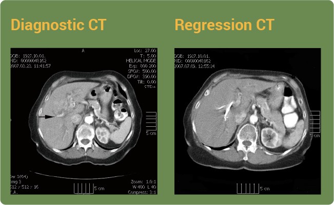 A 80-years old female was diagnosed with stage IV cholangiocarcinoma with hepatic metastasis. Standard oncology therapy was unavailable. Expected survival was just a few months. After consuming our nutritional compositions the tumor regressed as shown by the CT image. The arrow shows the tumor location.
