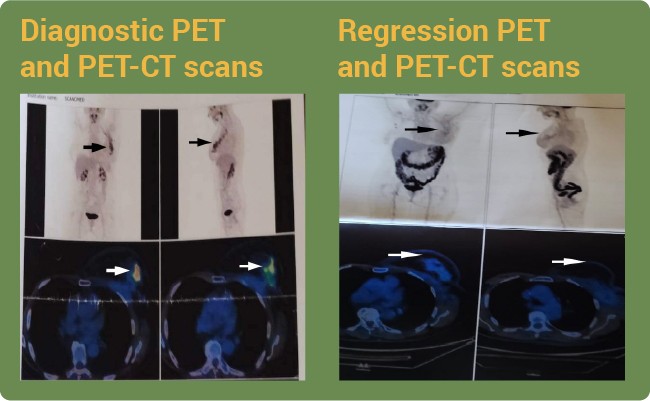 A 72-year-old female was diagnosed with stage IV breast cancer with lymph node metastases. She gave up on standard oncology care due to side effects. Arrows point to a tumor on PET-CT. After consuming our nutritional composition, a tumor regression was observed.