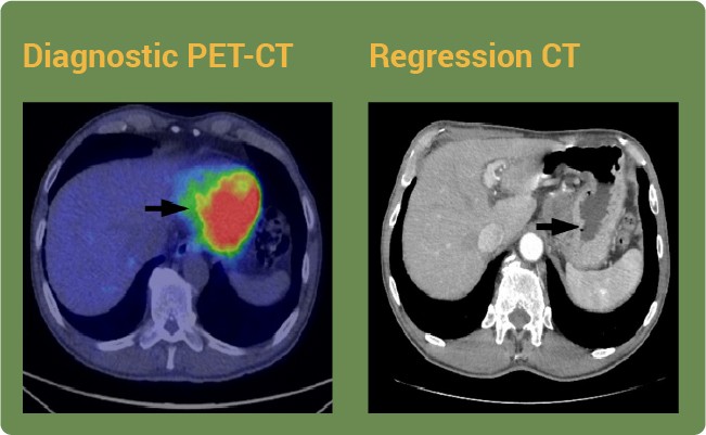 Control PET-CT demonstrated metabolic and morphological regression of the breast tumor, while the malignant lymph nodes and skeletal metastases resolved. The liver damage and abnormal blood cell counts were reversed. She is now tumor-free.